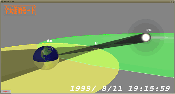 In Solar System Simulation live, host uses a computer software, named Solar System Simulator. The software can simulate various astronomical phenomena such as motions of planets (figure 2) and Galileian satellites of Jupiter, meteor swarm, and solar eclipse (figure 3), the night sky view from the earth; orbital parameters of all planets, some comets, and Galileian satellites of Jupiter, and the moon are set as well as positional data of stars on the celestial sphere. A host can explain how our solar system looks like, why Galileian satellites moves around Jupiter, how meteor swarm occurs by a dust swarm emitted by a comet, and why a solar eclipse occurs.