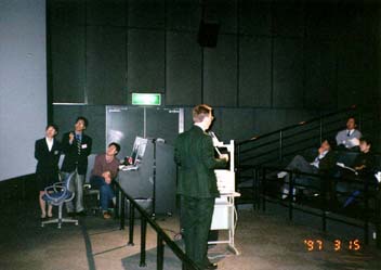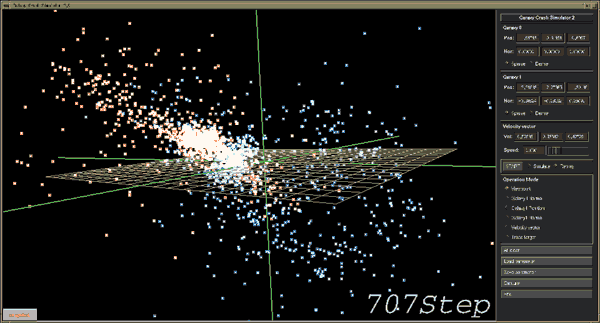 A host first gives brief descriptions about a galaxy and shows the pictures of various types of galaxies, including interacting galaxies such as Cartwheel galaxies and Antenna galaxies. He explains the peculiar shapes of these galaxies in terms of galaxy-galaxy collision using computer graphics movies based on N-body simulation. After that, the real-time simulation of a galaxy collision is performed using GRAPE (GRAvity PipE)-3AF connected to SGI Power Onyx. GRAPE-3AF is a special purpose computer for gravitational many body systems (Okumura et al. 1993). The host picks up an audience and asks him or her to set the parameters of the collision to perform. The simulation can be seen from arbitrary point of view (figure 4). The highlight scene of the collision is printed by a color printer and given to the person, who adapt the parameters as a souvenir.