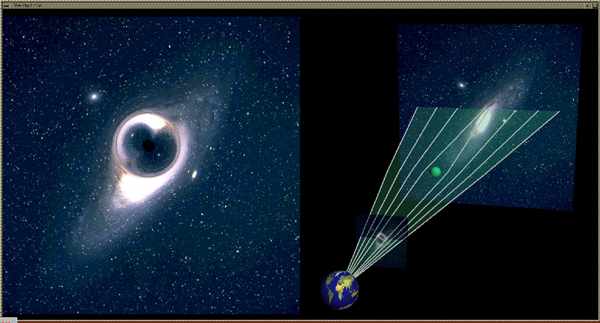 A host first describes about what is gravitational lens using M31 image as a background (figure 5) and the picture of a lensed cluster galaxy taken by Hubble Space Telescope. After the explanation, the host picks up an audience and take a photo image of his or her face. The picture is used as background of gravitational lens, and deformed. The person who was taken image can place the black hole wherever he or her likes. The deformed image is printed and given to him or her as a souvenir.
